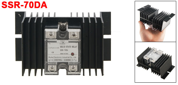 Details70A DC-AC Single Phase Solid State Relay SSR DC 3-32V / AC 24-480V + Heat Sink  Product Name Solid State Relay + Heat Sink Model SSR-70DA Material Metal, Aluminum, Plastic Rated Load Current 70A Input DC 3-32V Output AC 24-480V Total Size (Approx.) 12.7 x 7 x 5.5cm / 5" x 2.8" x 2.2" (L * W * H ) Color Black, Silver Tone Weight 264g Package Content 1 x Solid State Relay 1 x Heat Sink