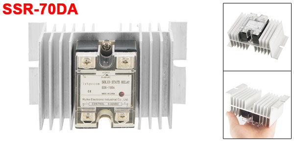 Product Name Solid State Relay + Heat Sink Model SSR-70DA Material Metal, Aluminum, Plastic Rated Load Current 70A Input DC 3-32V Output AC 24-480V Total Size (Approx.) 12.7 x 7 x 5.5cm / 5" x 2.8" x 2.2" (L * W * H ) Color Black, Silver Tone Weight 267g Package Content 1 x Solid State Relay