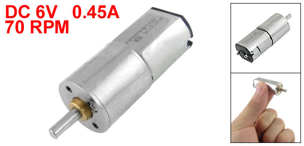 Product Name DC Geared Motor Rated Voltage DC 6V Rated Current 0.45A ( no load ) Speed 70 RPM Shaft Diameter 3mm/ 0.118" Gearbox Size 16 x 17mm/ 0.63" x 0.67" (D*H) Overall Size 16 x 57mm/ 0.63" x 2.2" (D*H) Main Color Silver Tone Material Metal Weight 23g Package 1 x DC Geared Motor - Reviews