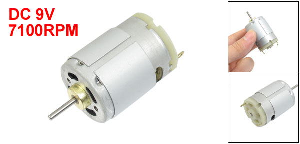 Product Name DC Micro Motor Model 385-2173-57 Rated Voltage DC 9V Speed(no load) 7100RPM Body Size 29 x 45mm/ 1.1" x 1.8" (D*H) Shaft Diameter 2.5mm/ 0.098" Total Length 57mm/ 2.4" Main Color Silver Tone Material Metal Weight 76g Package 1 x DC Micro Motor - Reviews