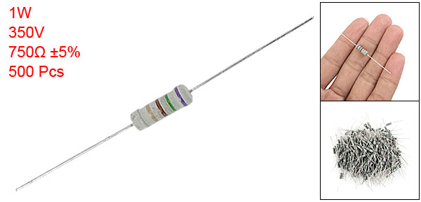 Details750 ohm 1W Watt 5% Axial Carbon Film Resistors 500 Pcs  Product Name Carbon Film Resistor Material Type Carbon Film Rated Power 1W Resistance Value 750 ohm Tolerance ±5% Withstand Voltage 350V Body Size (Approx.) 10.7 x 3.5mm /0.42" x 0.14" (L*Dia.) Lead Size (Each End) 23 x 0.4mm/0.9" x 0.016" (L*Dia.) Color As Picture Shown Weight 174g Package Content 500 Pcs(±2%) x Carbon Film Resistors