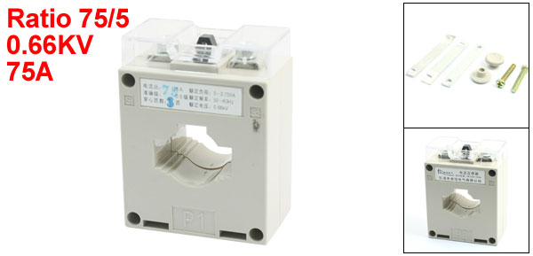 Item Name Current Transformer Model Number BH-0.66CT Rated Current Ratio 75/5 Accuracy Class 0.5 Rated Voltage 0.66KV Working Frenquency 50Hz - 60Hz Conductor Through 3T Primary Current 75A Secondary Load Capacity 5-3.75VA Opening Size 32 x 25mm/1.2" x 1“(L*W) Total Size 5 x 3.8 x 6cm/2" x 1.5" x 2.4"(L * W * H) Case Material Plastic Color Gray Weight 250g Package Content 1 x Current Transformer