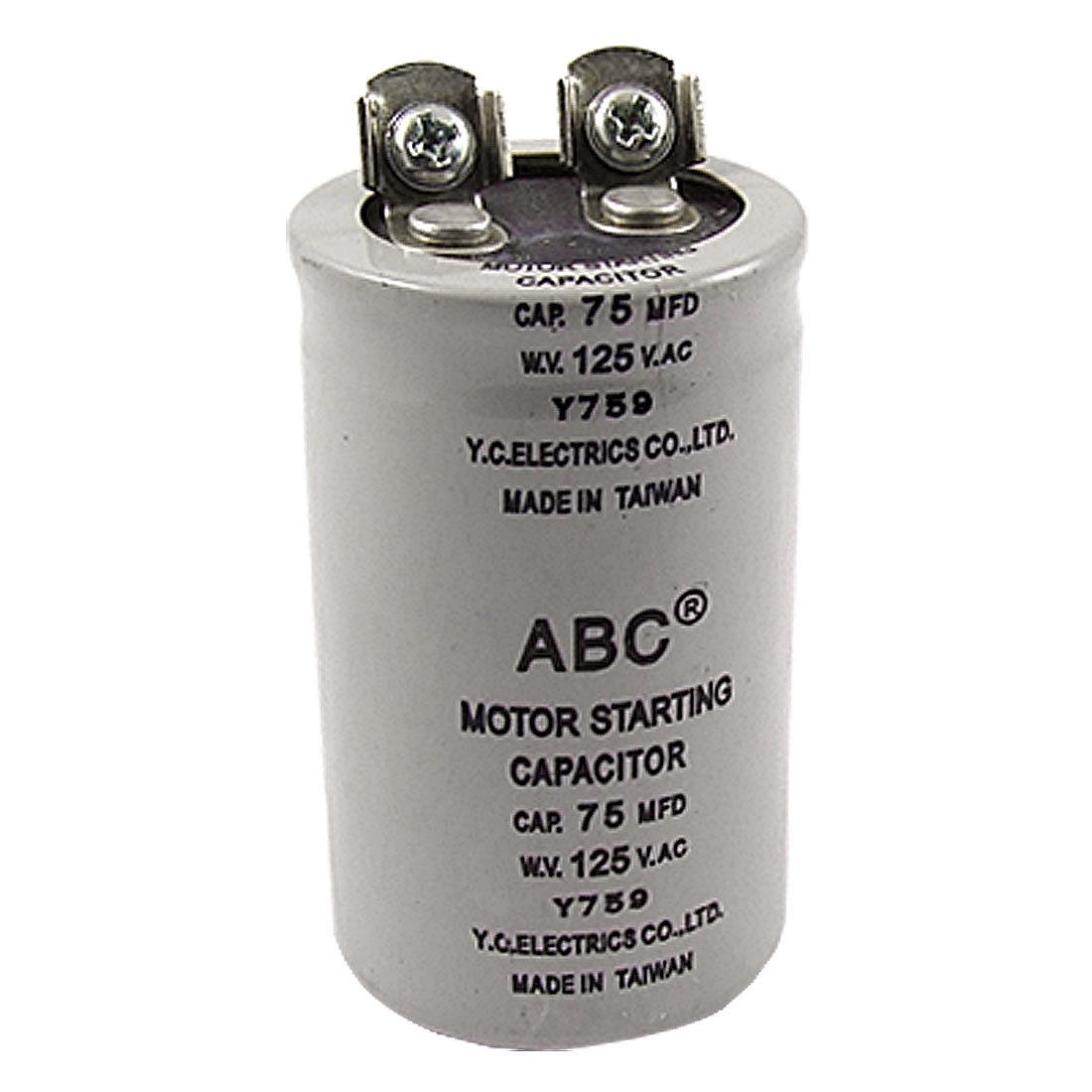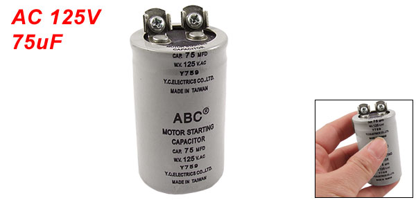 Product Name Motor Starting Capacitor Dieletric Material Metallized Paper Capacitance 75MFD(75uF) Withstand Voltage AC 125V Tolerance ±5% Body Size (Approx.) 35 x 60mm / 1.3" x 2.3" (D * H) Color Gray Weight 63g Package Content 1 x Motor Starting Capacitor - Reviews