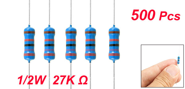 Product Name Metal Film Resistor Rated Power 1/2W Tolerance ±1% Resistance Value 27K Ω T.C.R (Temperature Coefficient) ±50ppm/°C Body Size 3 x 9mm / 0.12" x 0.35" (D*L) Lead Dia. (Approx.) 0.3mm / 0.012" Total Length (Approx.) 60mm / 2.36" Color As Picture Shown Net Weight 131g Package Content 500 Pcs (±2%) x Metal Film Resistors - Reviews