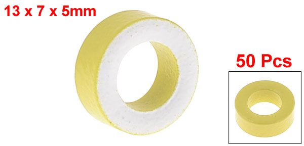Product Name Ferrite Cores Model 50-26E Material Iron Color Yellow, White Overall Size 13 x 7 x 5mm/ 0.51" x 0.28" x 0.2"(Outside Dia.*Inner Dia.*T) Total Weight 134g Package Content 50(±2%) x Toroid Ferrite Cores - Reviews