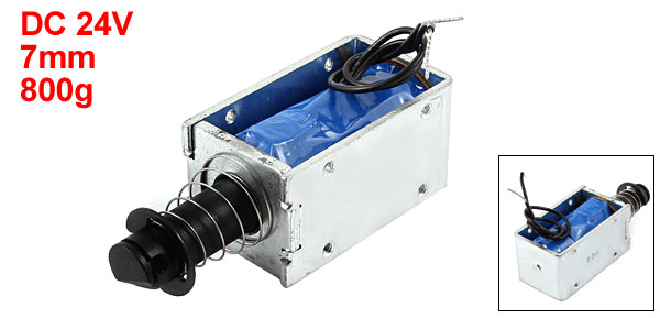 Product Name DC Solenoid Electromagnet Rated Voltage DC 24V Current 2A Power 48W Type Pull Stroke & Force 7mm, 800g Plunger Hole Dia. 3mm/0.12" Plunger Dia. 12mm/0.47 Total Size 70 x 20 x 22mm/2.76" x 0.8" x 0.87"(L*W*H) Cable Length 10cm/3.9" Material Metal, Electronic Parts Net Weight 197g Package Content 1 x DC Solenoid Electromagnet - Reviews