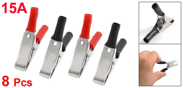 Product Name Alligator Clip Material Plastic, Metal Color Black, Red, Silver Tone Rated Current 15A Overall Size(Each) 53 x 50 x 10mm / 2.1" x 2" x 0.4"(L*W*T) Jaw Open Width 20mm / 0.787"(Max.) Weight 49g Package Content 8 x Alligator Clips - Reviews