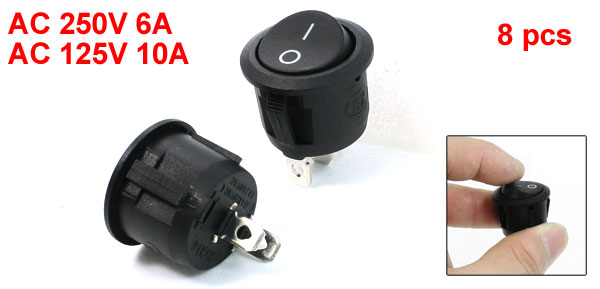 8 pcs 2 Pin SPST On/Off Round Head Rocker Switch Black 6A/250V 10A/125V AC