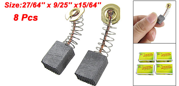 Product Name Carbon Brush Carbon Brush Size(Each) 12 x 9 x 6mm/27/64'' x 9/25'' x 15/64'' (L*W*T) Total Length(Approx) 31mm/1.2'' (When Spring Stretching) Material Carbon & Metal Color Black & Gold Tone Net Weight 14g Package Content 8 x Carbon Brush - Reviews