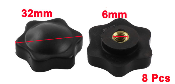 Product Name Star Knob Head Diameter 32mm / 1.3" Threaded Diameter 6mm / 0.24" Total Height 15mm / 0.59" Material Metal & Plastic Color Black Weight 54g Package Content 8 x Star Knob - Reviews