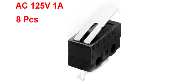 Product Name Micro Switch Actuator Type Low-Force Lever Actuator Action Momentary Contact Type SPDT 1 NO 1 NC 1 Com Terminal Type Plug-in Pins Rated Power AC 125V 1A Lever Length 13mm/0.5" Mounting Hole Dia 2mm / 0.08" Pin Distance 5mm(C---NO) 5mm(NO---NC) Body Size 12 x 5.5 x 6cm / 0.47" x 0.22" x 0.24"(L*W*H) Material Metal, Plastic Color Black Net Weight 5g Package Content 8 x Micro Switch - Reviews