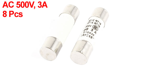 Product Name Cylindrical Fuse Link Material Metal, Ceramic, Electronic Parts Rated Voltage & Current AC 500V, 3A Dimensions 10 x 38mm/0.4" x 1.5" (Dia*L) Main Color White, Silver Tone Weight 48g Package Content 8 Pcs x Cylindrical Fuse Links - Reviews