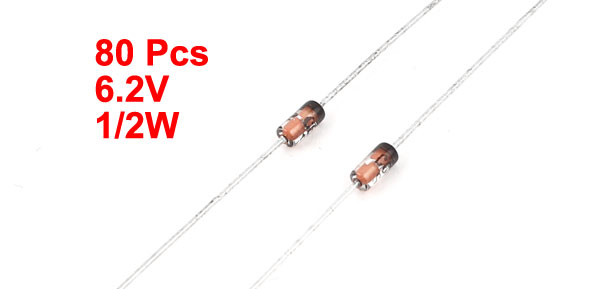 Details80 Pcs Axial Lead Zener Diodes Voltage Regulator BZX79-C6V2 1/2W 6.2V  Product Name Zener Diodes Model BZX79-C6V2 Type Axial Lead Rating Voltage 6.2V Power 1/2W Overall Size 65 x 2mm/2.6" x 0.08"(L*D) Weight 13g Package Content 80(±2%) x Zener Diodes