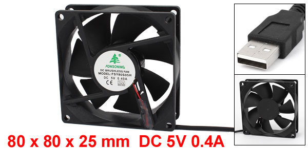 Product Name Cooling Fan Rated Power DC 5V 0.4A Connector 2.0 USB Connector Total Size 80 x 80 x 25 mm / 3" x 3" x 1" (L*W*H) Mount Hole Dia. 4mm/0.16" Cable Length 90cm/35" Material Plastic Main Color Black Weight 74g Package Contain 1 x Cooling Fan