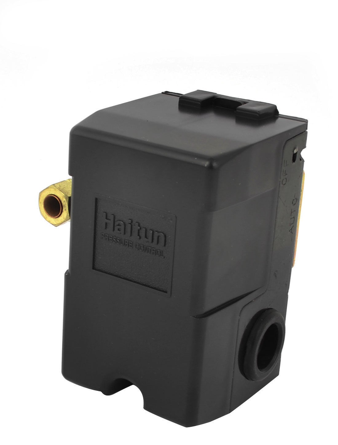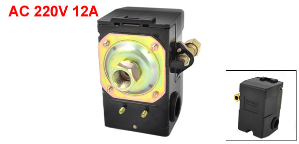 Details85-114PSI 1/4NPT One Port Pressure Switch Control Valve for Air Compressor  Product Name Pressure Switch Model CQ10-H Rated Voltage AC 220V 12A Pressure Range 6-8kgf/cm² / 85-114PSI Female Thread Diameter 12mm/1/4 NPT Size 9.1 x 7.1 x 8cm / 3.6" x 2.8" x 3.1" (L*W*H) Material Plastic, Metal Color Black, Gold Tone Net Weight 362g Package Content 1 x Air Compressor Pressure Switch