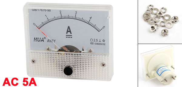 Product Name Analog Ammeter Model 85C1 Measuring Current Range AC 5A Accuracy Class 2.5 Total Size 6 x 5.5 x 5cm/2.4" x 2.2" x 1.9"(L*W*T) Color Clear, Black Weight 55g Package Content 1 x Analog Ammeter
