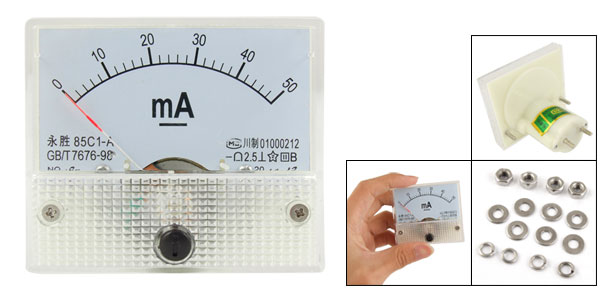 Product Name Analog Ammeter Model No. 85C1-A Measuring Current Range DC 0-50mA Accuracy Class 2.5 Meter Face Size(Approx.) 6.3 x 5.5 x 1cm / 2.5" x 2.2" x 0.39"(L*W*T) Thread Size 0.28 x 0.75cm / 0.11" x 0.30"(Dia.*L) 0.28 x 1cm / 0.11" x 0.4"(Dia.*L) Overall Depth 5.6cm / 2.2" Material Plastic, Electronic Components Color White Net Weight 59g Package Content 1 x Analog Ammeter Several Installing Parts - Reviews