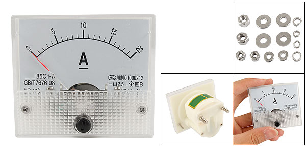 Product Name Analog Ammeter Model No. 85C1-A Measuring Current Range DC 0-20A Accuracy Class 2.5 Meter Face Size(Approx.) 6.3 x 5.5 x 1cm / 2.5" x 2.2" x 0.39"(L*W*T) Thread Size 0.38 x 0.8cm / 0.11" x 0.3"(Dia.*L) 0.28 x 1cm / 0.11" x 0.4"(Dia.*L) Overall Depth 5.8cm / 2.28" Material Plastic, Electronic Components Color White Net Weight 68g Package Content 1 x Analog Ammeter Several Installing Parts - Reviews