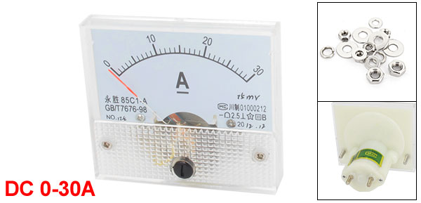 Details85C1-A DC 0-30Amp Class 2.5 Precision Panel Mounted Analog Ammeter Meter  Product Name Analog Ammeter Model No. 85C1-A Measuring Current Range DC 0-30A Accuracy Class 2.5 Panel Size 64 x 56mm / 2.5" x 2.2" (L*W) Thread Dia 3mm/0.12" Overall Depth 4.7cm / 1.85" Mount Panel Material Plastic, Electronic Components Color White, Beige, Clear Net Weight 59g Package Content 1 x Analog Ammeter