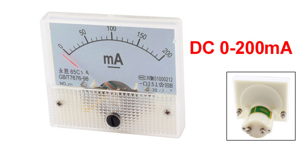 Product Name Analog Ammeter Model 85C1-A Measuring Current Range DC 0-200mA Accuracy Class 2.5 Thread Dia 3mm/0.12" Panel Size 64 x 56 mm/2.5" x 2.2"(L*W) Total Size 64 x 56 x 47mm/2.5" x 2.2" x 1.8"(L*W*T) Color Clear, Black Weight 76g Package Content 1 x Analog Ammeter