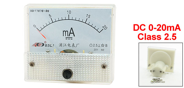 Product Name Analog Amperemeter Model 85C1 Measuring Ampere Range DC 0-20mA Accuracy Class 2.5 Total Size 64 x 56 x 56mm / 2.5" x 2.2" x 2.2"(L*W*T) Thread Dia. 3mm/ 0.12"