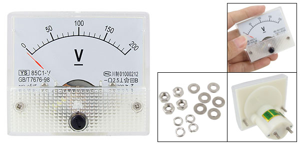 Product Name Analog Voltmeter Model 85C1 Measuring Voltage Range DC 0 - 200V Accuracy Class 2.5 Meter Face Size(Approx) 6.3 x 5.5 x 1cm / 2.5" x 2.2" x 0.39"(L*W*T) Thread Size 0.37 x 0.83cm / 0.15" x 0.33"(D*L) Overall Depth 5.77cm / 2.27" Color White Net Weight 64g Package Content 1 x Analog Voltmeter Several Installing Parts - Reviews