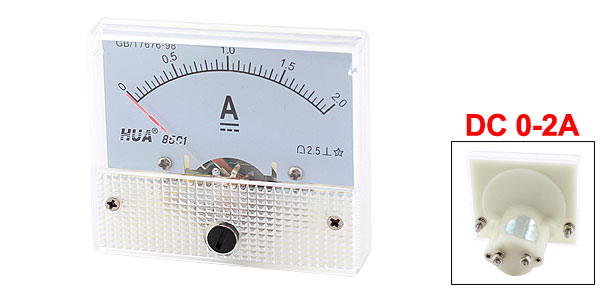 Product Name Analog Ammeter Model No. 85C1 Measuring Current Range DC 0-2A Accuracy Class 2.5 Meter Front Size(Approx.) 64 x 57 x 11mm / 2.5" x 2.2" x 0.43"(L*W*T) Thread Dia 3mm/ 0.12" Overall Depth 58mm / 2.3" Material Plastic, Electronic Components Color White, Off White Weight 70g Package Content 1 x Analog Ammeter