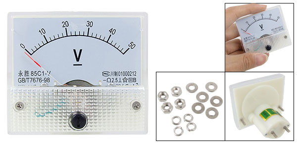 Product Name Analog Voltmeter Model 85C1 Measuring Voltage Range DC 0 - 50V Accuracy Class 2.5 Meter Face Size(Approx) 6.3 x 5.5 x 1cm / 2.5" x 2.2" x 0.39"(L*W*T) Thread Size 0.37 x 0.83cm / 0.15" x 0.33"(D*L) Overall Depth 5.77cm / 2.27" Color White Net Weight 61g Package Content 1 x Analog Voltmeter Several Installing Parts - Reviews