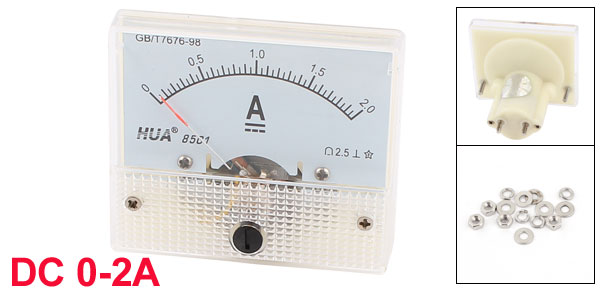Product Name DC Ampere Panel Meter Scale Range DC 0-2A Accuracy Class 2.5 Material Plastic Color White, Clear Back Screw Dia. 3.7 mm / 0.15" & 2.8 mm / 0.11" Panel Size 6.3 x 5.5 x 1.1 cm / 2.5" x 2.2" x 0.4" (L*W*T) Overall Depth 4.3 cm / 1.69" Weight 61g Package Content 1 x DC Ampere Panel Meter - Reviews