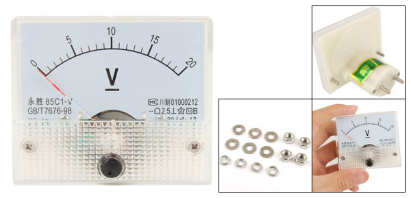 Details85C1 Rectangle Analog Voltmeter Panel Meter Gauge DC 0-20V  Product Name Analog Voltmeter Model 85C1 Measuring Voltage Range DC 0-20V Accuracy Class 2.5 Meter Face Size(Approx) 6.3 x 5.5 x 1cm/2.5" x 2.2" x 0.39"(L*W*T) Thread Size 0.28 x 0.8cm / 0.11" x 0.30"(Dia.*L) Overall Depth 5.8cm / 2.28" Color White Net Weight 58g Package Content 1 x Analog Voltmeter Several Installing Parts