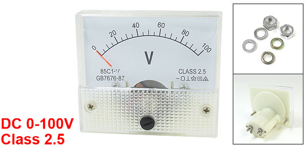 Product Name Analog Voltmeter Model 85C1-V Measuring Range DC 0-100V Accuracy Class 2.5 Meter Face Size(Approx) 6.4 x 5.6 x 1.1cm / 2.5" x 2.2" x 0.43"(L*W*T) Thread Size 0.28 x 0.75cm / 0.11" x 0.30" (D*L)
