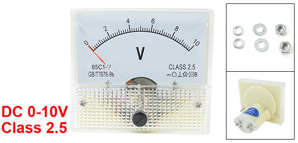 Product Name Analog Voltmeter Model 85C1-V Measuring Range DC 0-10V Accuracy Class 2.5 Meter Face Size(Approx) 6.4 x 5.6 x 1.1cm / 2.5" x 2.2" x 0.43"(L*W*T) Thread Size 0.28 x 0.75cm / 0.11" x 0.30" (D*L)