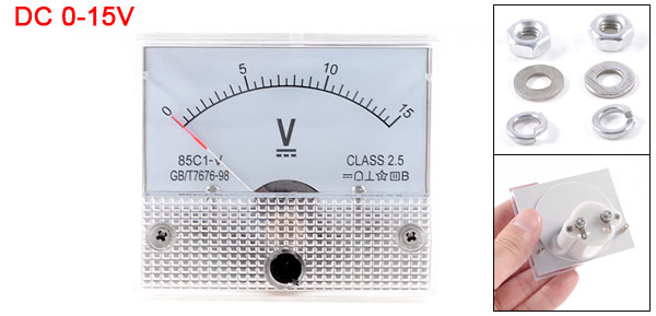 Product Name Analog Voltmeter Model 85C1-V Measuring Range DC 0-15V Accuracy Class 2.5 Meter Face Size(Approx) 6.4 x 5.6 x 1.1cm / 2.5" x 2.2" x 0.43"(L*W*T) Thread Size 0.28 x 0.75cm / 0.11" x 0.30" (D*L)