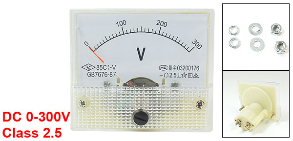 Product Name Analog Voltmeter Model 85C1-V Measuring Range DC 0-300V Accuracy Class 2.5 Meter Face Size(Approx) 6.4 x 5.6 x 1.1cm / 2.5" x 2.2" x 0.43"(L*W*T) Thread Size 0.28 x 0.75cm / 0.11" x 0.30" (D*L)