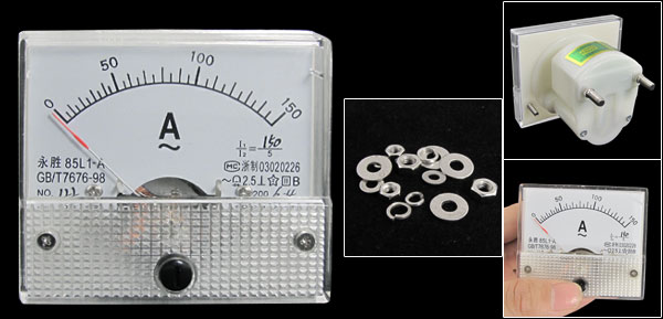 Product Name Analog Ammeter Model 85L1-A Measuring Current Range AC 0-150A Accuracy Class 2.5 Meter Face Size(Approx) 6.3 x 5.5 x 1cm / 2.5" x 2.2" x 0.39"(L*W*T) Thread Size 0.4 x 0.8cm / 0.16" x 0.31"(D*L) 0.3 x 0.8cm / 0.12" x 0.31"(D*L) Overall Depth 4.6cm / 1.8" Color White Net Weight 101g Package Content 1 x Analog Ammeter Several Installing Parts - Reviews