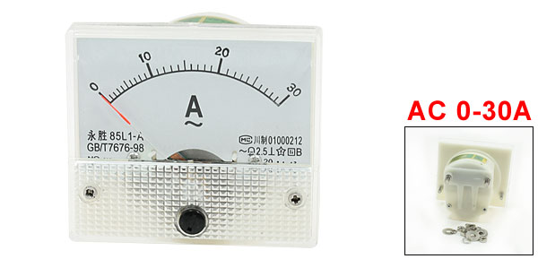 Product Name Analog Ammeter Model 85L1-A Measuring Current Range AC 0-30A Accuracy Class 2.5 Total Size 6.5 x 5.5 x 5.5cm/2.6" x 2.2" x 2.2"(L*W*T) Thread Dia. 3mm/ 0.12", 4mm/0.16" Color Clear, White Weight 109g Package Content 1 x Analog Ammeter