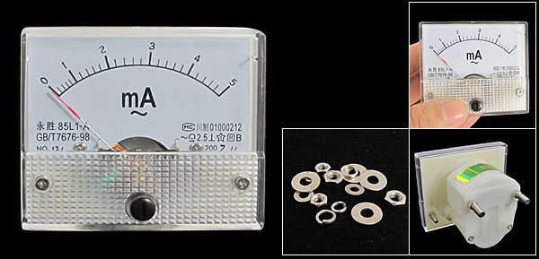 Product Name Analog Ammeter Model 85L1-A Measuring Current Range AC 0-5mA Accuracy Class 2.5 Meter Face Size(Approx) 6.3 x 5.5 x 1cm / 2.5" x 2.2" x 0.39"(L*W*T) Thread Size 0.4 x 0.8cm / 0.16" x 0.31"(D*L) 0.3 x 0.8cm / 0.12" x 0.31"(D*L) Overall Depth 4.6cm / 1.8" Color White Net Weight 72g Package Content 1 x Analog Ammeter Several Installing Parts - Reviews