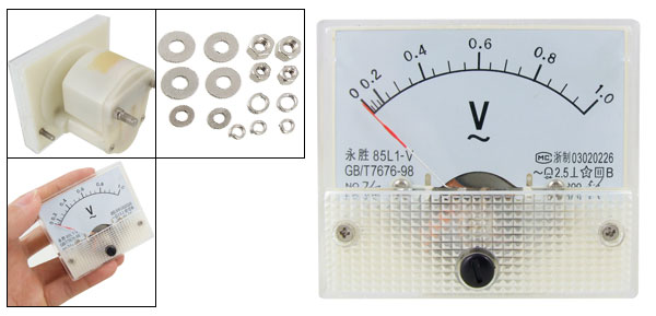Product Name Analog Voltmeter Model 85L1 Measuring Voltage Range AC 0 - 1.0V Accuracy Class 2.5 Meter Face Size(Approx) 6.3 x 5.5 x 1cm / 2.5" x 2.2" x 0.39"(L*W*T) Thread Size 0.28 x 0.75cm / 0.11" x 0.30"(D*L) 0.38 x 0.8cm / 0.15" x 0.3"(D*L) Overall Depth 5.7cm / 2.24" Color White Net Weight 72g Package Content 1 x Analog Voltmeter Several Installing Parts - Reviews
