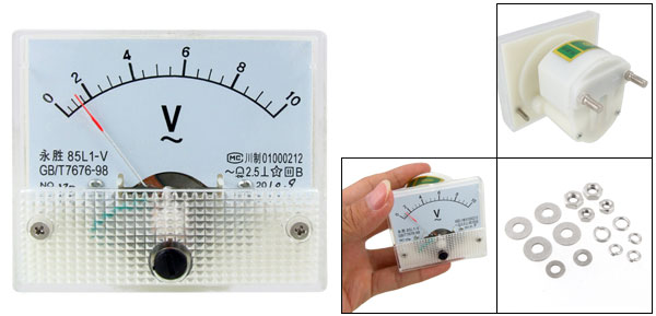 Product Name Analog Voltmeter Model 85L1 Measuring Voltage Range AC 0-10V Accuracy Class 2.5 Meter Face Size(Approx) 6.3 x 5.5 x 1cm / 2.5" x 2.2" x 0.39"(L*W*T) Thread Size 0.28 x 0.75cm / 0.11" x 0.30"(D*L) 0.38 x 0.8cm / 0.15" x 0.3"(D*L) Overall Depth 5.7cm / 2.24" Color White Net Weight 69g Package Content 1 x Analog Voltmeter Several Installing Parts - Reviews