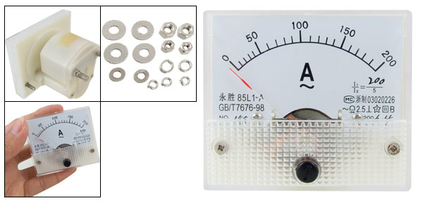 Product Name Analog Ammeter Model 85L1 Measuring Current Range AC 0-200A Accuracy Class 2.5 Meter Face Size(Approx) 6.3 x 5.5 x 1cm / 2.5" x 2.2" x 0.39"(L*W*T) Thread Size 0.28 x 0.75cm / 0.11" x 0.30"(D*L) 0.38 x 0.8cm / 0.15" x 0.3"(D*L) Overall Depth 5.7cm / 2.24" Color White Net Weight 103g Package Content 1 x Analog Ammeter Several Installing Parts - Reviews