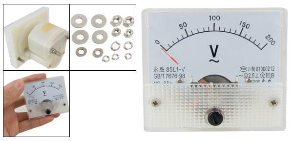 Product Name Analog Voltmeter Model 85L1 Measuring Voltage Range AC 0-200V Accuracy Class 2.5 Meter Face Size(Approx) 6.3 x 5.5 x 1cm / 2.5" x 2.2" x 0.39"(L*W*T) Thread Size 0.28 x 0.75cm / 0.11" x 0.30"(D*L) 0.38 x 0.8cm / 0.15" x 0.3"(D*L) Overall Depth 5.7cm / 2.24" Color White Net Weight 71g Package Content 1 x Analog Voltmeter Several Installing Parts - Reviews