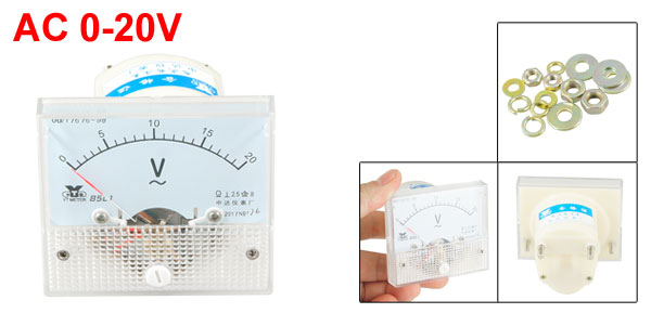 Product Name Analog Voltmeter Model 85L1 Measuring Range AC 0-20V Accuracy Class 2.5 Meter Face Size(Approx) 6.3 x 5.5 x 1cm / 2.5" x 2.2" x 0.39"(L*W*T) Thread Size 0.28 x 0.75cm / 0.11" x 0.30"(D*L)
