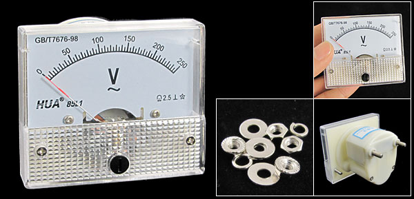 Product Name Analog Voltmeter Model 85L1 Measuring Voltage Range AC 0 - 250V Accuracy Class 2.5 Meter Face Size(Approx) 6.3 x 5.5 x 1cm / 2.5" x 2.2" x 0.39"(L*W*T) Thread Size 0.37 x 0.8cm / 0.14" x 0.31"(D*L) 0.27 x 0.8cm / 0.1" x 0.31"(D*L) Overall Depth 5cm / 2" Color White Net Weight 70g Package Content 1 x Analog Voltmeter Several Installing Parts - Reviews