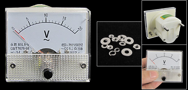 Product Name Analog Voltmeter Model 85L1-V Measuring Voltage Range AC 0-20V Accuracy Class 2.5 Meter Face Size(Approx) 6.3 x 5.5 x 1cm / 2.5" x 2.2" x 0.39"(L*W*T) Thread Size 0.38 x 0.8cm / 0.15" x 0.31"(D*L) 0.27 x 0.8cm / 0.1" x 0.31"(D*L) Overall Depth 4.7cm / 1.8" Color White Net Weight 71g Package Content 1 x Analog Voltmeter Several Installing Parts - Reviews