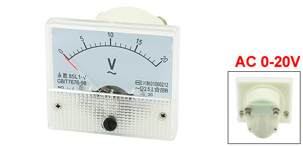 Details85L1-V Class 2.5 AC 0-20V Screw Mounted Voltage Panel Meter Voltmeter  Product Name Analog Voltmeter Model 85L1-V Measuring Current Range AC 0-20V Accuracy Class 2.5 Meter Face Size(Approx) 6.4 x 5.6 x 1cm / 2.5" x 2.2" x 0.4" (L*W*T) Screw Thread Diameter 4mm / 0.16" 3mm/0.12" Overall Depth 6cm / 2.4" Main Color White, Beige Weight 83g Package Content 1 x Analog Voltmeter Several Fittings