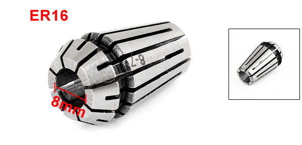 Product Name Spring Collet Model No. ER16 Clamping Range 8-7mm/ 0.31"-0.28" Clamping Diameter 8mm/ 0.31" Overall Size 17 x 28mm/0.67" x 1.1"(Dia*Length) Material Stainless Steel Color Silver Tone Net Weight 19g Package Content 1 x Spring Collet - Reviews