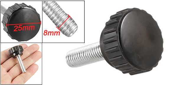 Product Name Knurled Knob Type Screw On Head Diameter(Approx) 25mm / 0.984" Thread Pole Length(Approx) 30mm / 1.181" Thread Pole Diameter(Approx) 8mm / 0.315" Overall Height 46mm / 1.811" Material Metal & Plastic Color Silver Tone & Black Weight 22g Package Content 1 x Knurled Knob - Reviews