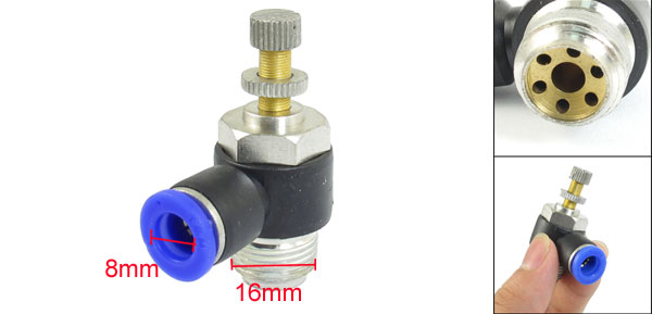 Product Name Pneumatic Speed Controller Inner Diameter (Blue End) 8mm / 0.31" Thread Outer Diameter 16mm / 3/8" PT Total Size 50 x 40 x 22mm / 2" x 1.6" x 0.87" (L*W*T) Material Plastic, Metal Color Blue, Black, Silver Tone Weight 48g Package Content 1 x Speed Controller - Reviews