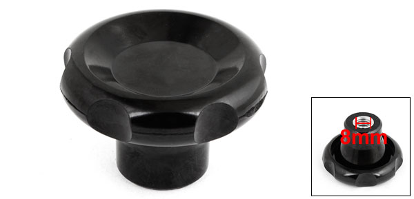Product Name Star Knob Type Screw On Head Diameter 50mm / 2" Female Thread Diameter 8mm / 0.3" Female Thread Depth 22mm / 0.87" Total Height 34mm / 1.3" Material Metal, Plastic Color Black Weight 46g Package Content 1 x Star Knob - Reviews