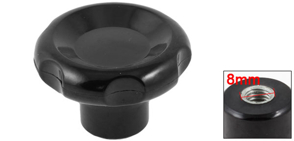 Product Name Star Knob Type Screw On Head Diameter 50mm / 2" Female Thread Diameter 8mm / 0.3" Female Thread Depth 17mm / 0.67" Total Height 33mm / 1.3" Material Metal, Plastic Color Black Weight 44g Package Content 1 x Star Knob - Reviews